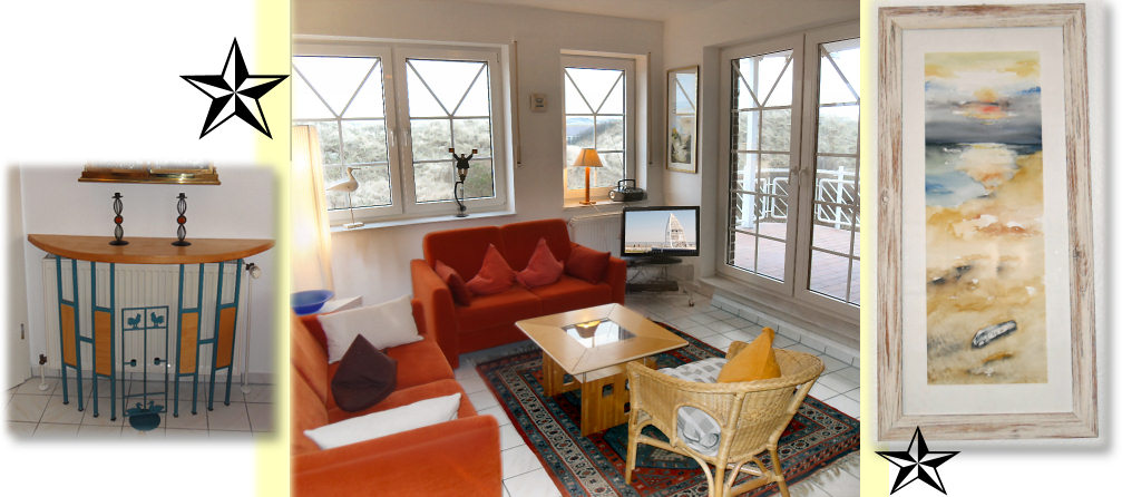 in der "Residenz am Meer" - Billstraße 24 D. 1. Etage, Nordseite, freier Blick auf Dünenlandschaft und Garten. Ausstattung: 2 Schlafzimmer, 1x mit Doppelbett, 1x mit 2 Einzelbetten, (Reisebett möglich) Wohnraum mit Küchenzeile, Badezimmer mit Dusche/WC und Waschmaschine. Im Wohnzimmer ist einen Schlafcouch Balkon zur Dünenseite mit seitlichem Blick aufs Wattenmeer |
