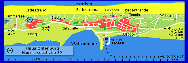 Nach Ihrer Ankunft mit der Fähre im Hafen von Juist können Sie am besten den bereitstehenden Pferdekutschendienst in Anspruch nehmen. Die Fahrzeit beträgt etwa 30 Minuten - die Ausstiegsstation ist das Lebensmittelgeschäft im Loog. Alternativ ist der Fußweg möglich, ca. 35 Min. bei normalem Schritttempo. Der Weg zum Haus Oldenburg im Ortsteil Loog verläuft großenteils hintern Deich - der Billstraße. Diese erreichen Sie, wenn Sie vom Hafen kommend gleich links hinter der Deichscharte (Deichpassage) einbiegen. Das Ufer des Wattenmeers bleibt lange Zeit sichtbar zur Linken. Sie haben das Loog erreicht, wenn Sie den Kinderspielplatz sehen. Bleiben Sie aber auf der Hauptstraße, die ab dem Loog |